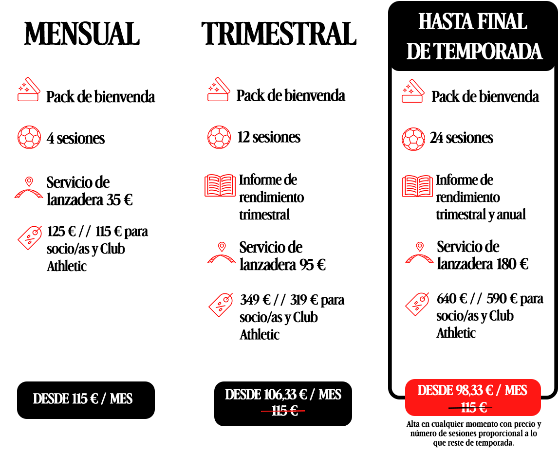 Por otro lado, para los socios del Athletic Club y miembros del Club Athletic, la cuota trimestral de la inscripción Trimestral (12 sesiones) es de 319€ y la cuota trimestral de la inscripción de Temporada es de 290€ (Un total de 870€ para las 36 sesiones de toda la temporada). Según avance la temporada este programa y su precio se adaptarán a los trimestres restantes hasta la finalización de la temporada el 30 de Junio. Incluye un informe detallado elaborado por los técnicos del Athletic Club sobre las capacidades y mejora del jugador durante su trimestre en Eskola.