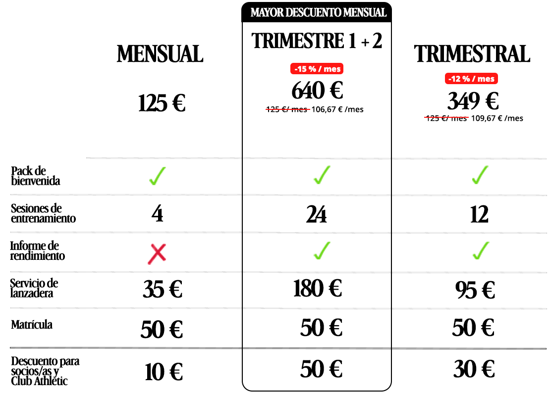 Hay tres planes de contratación, Mensual, Trimestral y de Temporada. Cada mes está configurado por 4 sesiones de entrenamiento, cada trimestre a su vez está configurado por 12 sesiones de entrenamiento, y la temporada completa incluye 36 sesiones de entrenamiento en total. No obstante, los pagos de la inscripción de Temporada también serán trimestrales, sujetos a un precio inferior al haber adquirido el plan de Temporada.