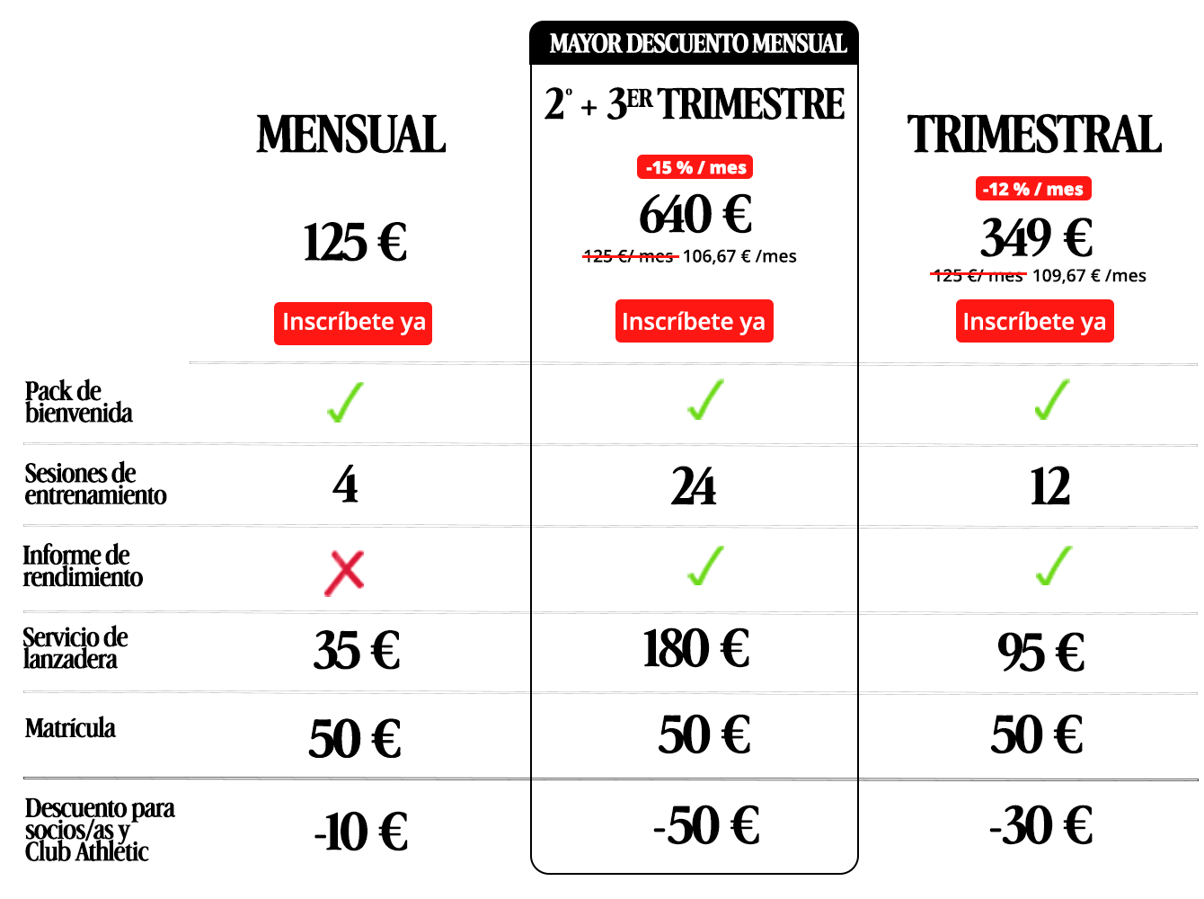 Hay tres planes de contratación, Mensual, Trimestral y de Temporada. Cada mes está configurado por 4 sesiones de entrenamiento, cada trimestre a su vez está configurado por 12 sesiones de entrenamiento, y la temporada completa incluye 36 sesiones de entrenamiento en total. No obstante, los pagos de la inscripción de Temporada también serán trimestrales, sujetos a un precio inferior al haber adquirido el plan de Temporada.